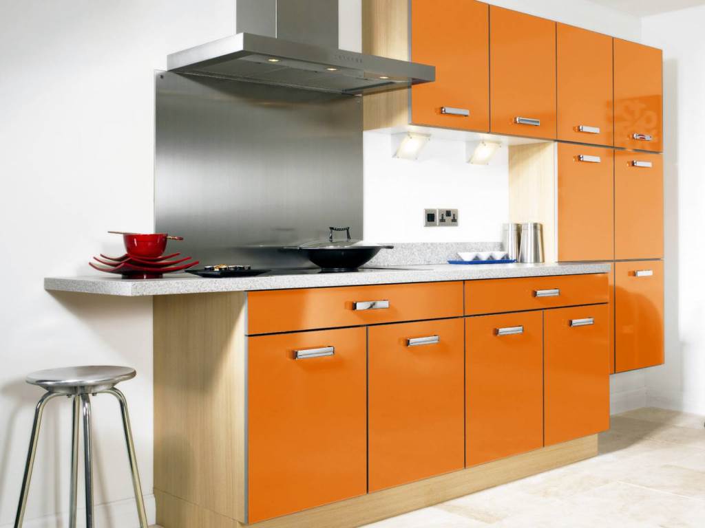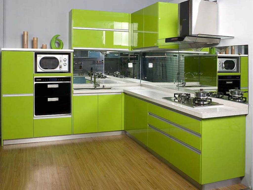Любители стиля хай-тек предпочитают прямые кухонные фасады из пластика различной цветовой гаммы в сочетании с фасадами из алюминия, либо фасадами из МДФ с окраской под алюминий. Отлично сочетаются однотонные фасады из пластика с яркой стеновой панелью с нанесением фото изображения. Таже возможны стеклянные фасады с нанесением рисунка. Следует обратить внимание на возможность изготовления фасадов из пластика со стеклом, которые порой становятся изюминкой готовой кухни.