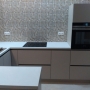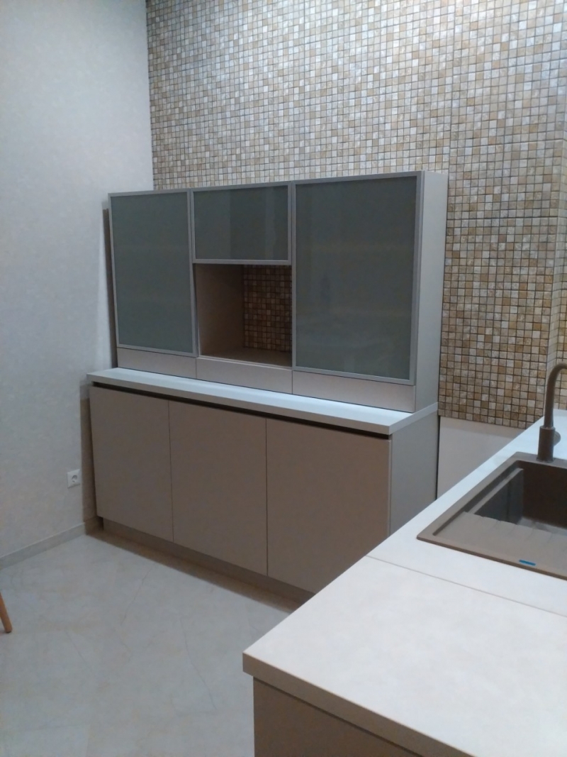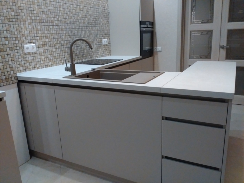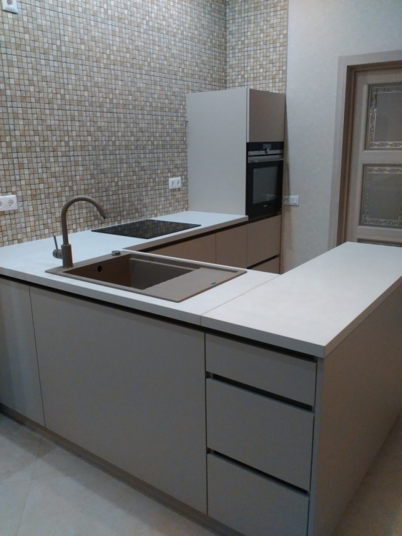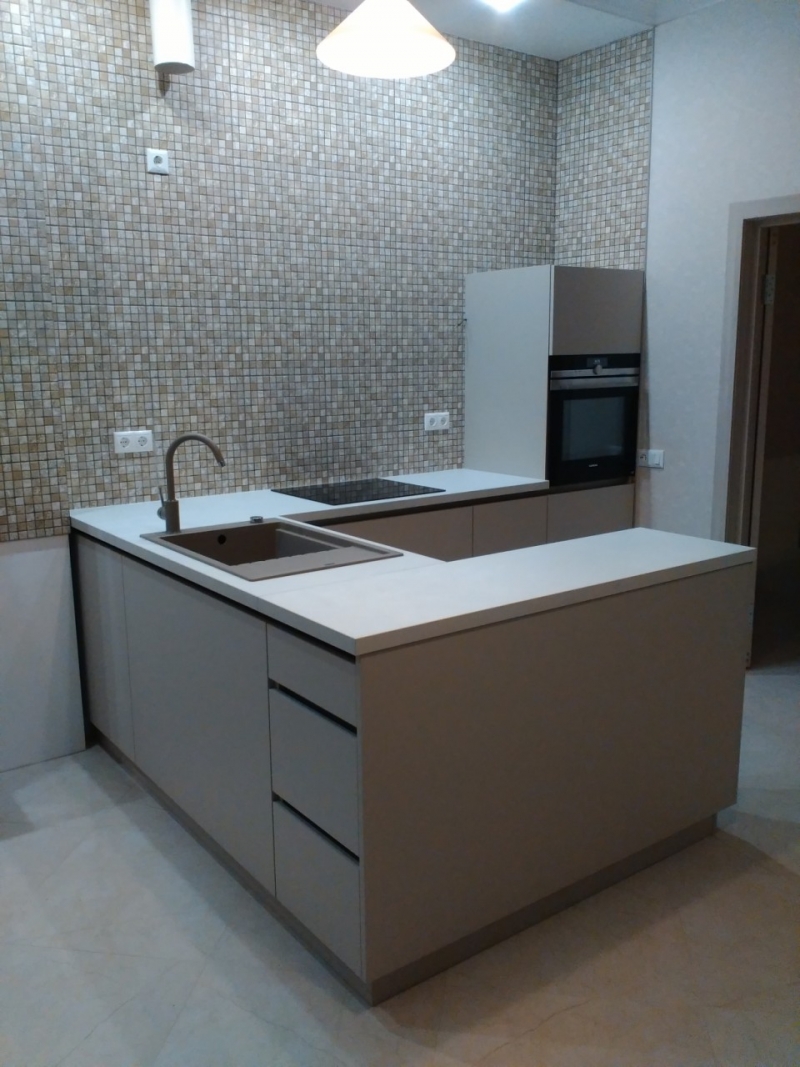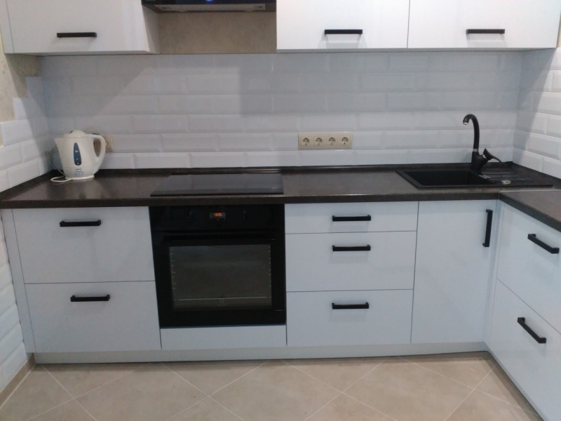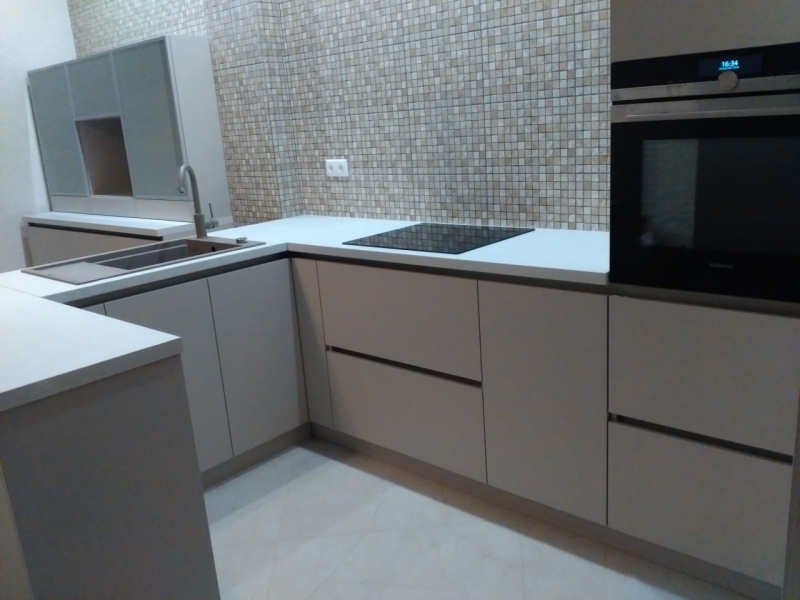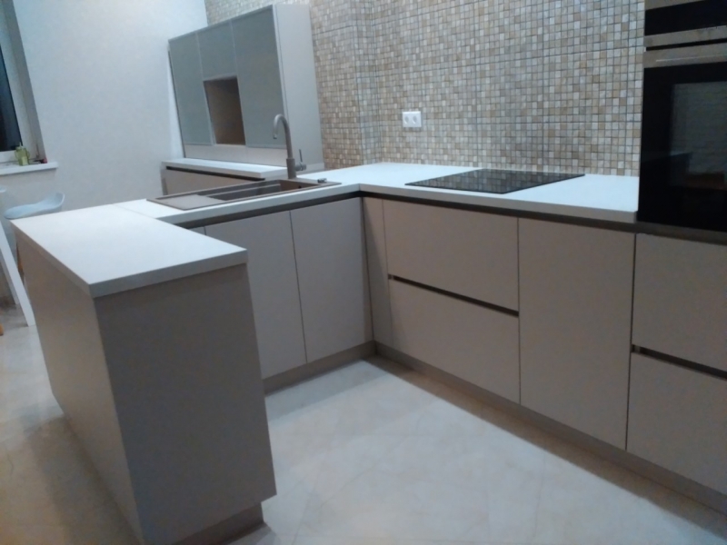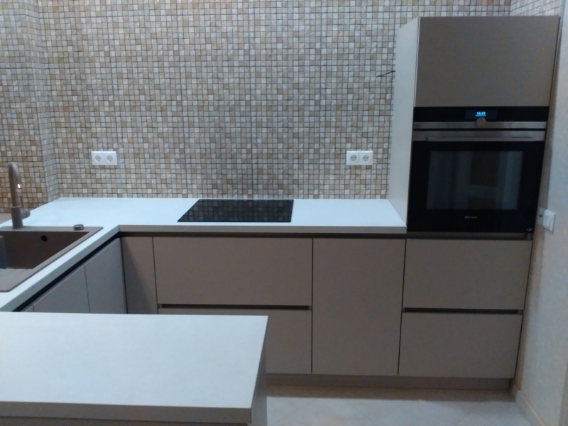 Кухня на заказ с фасадами из матового акрила со встроенным Gola-профилем. В кухне встроены: посудомоечная машина, духовка, варочная панель. Сушка для посуды расположена в нижнем выдвижном ящике.