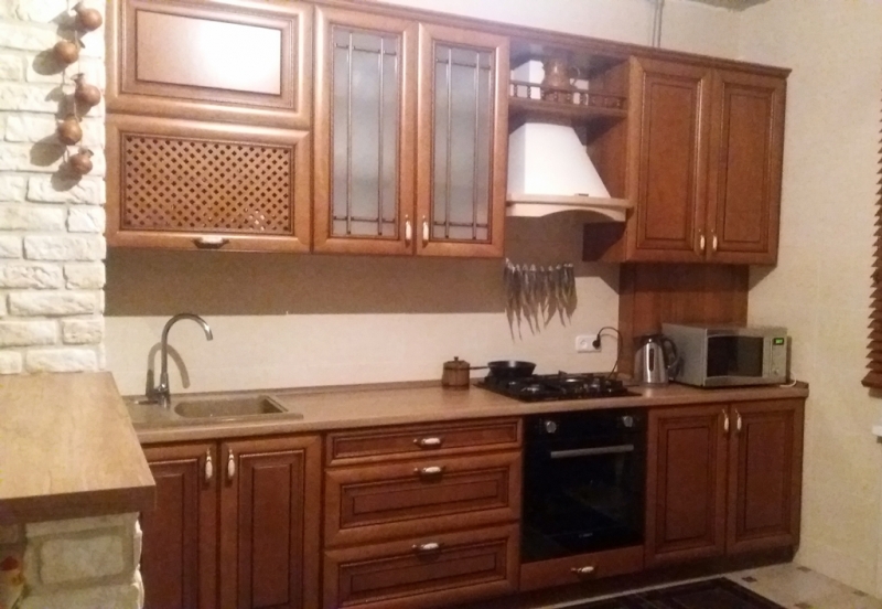 Кухня на заказ от фабрики ЗОВ с фасадами из массива ольхи. Натуральное дерево создаёт неповторимый уют и теплоту в доме.