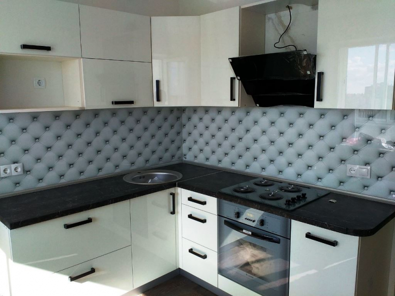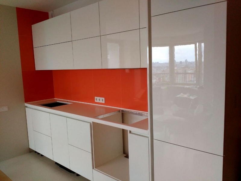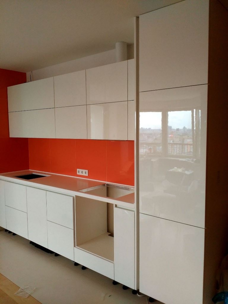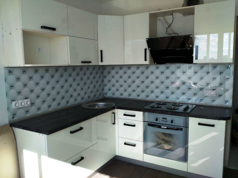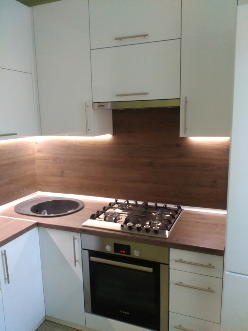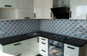 Угловая кухня под заказ с фасадами из пластика. Скинали - закаленное стекло с фотопечатью. Столешница - постформинг Egger. Фурнитура BLUM, Hettich.