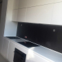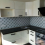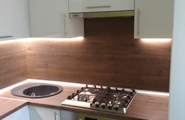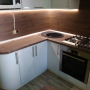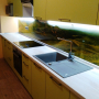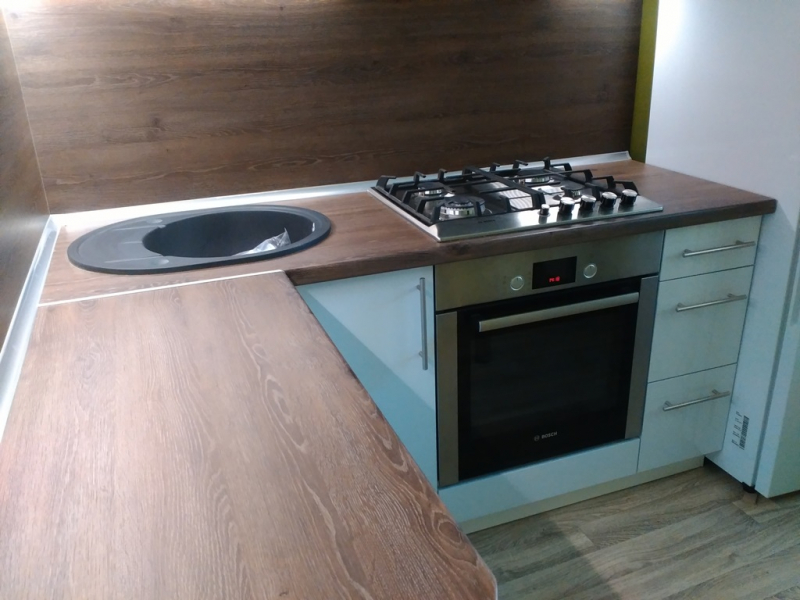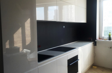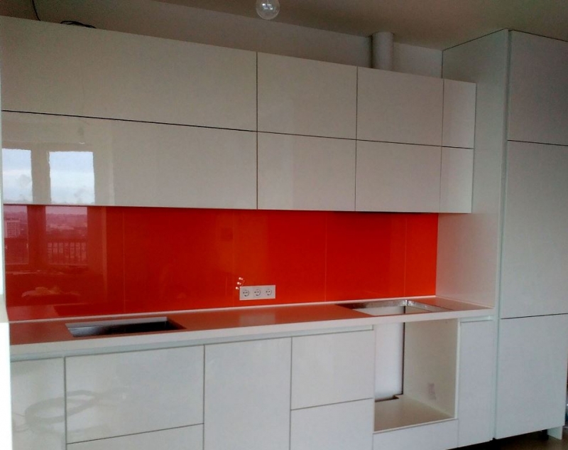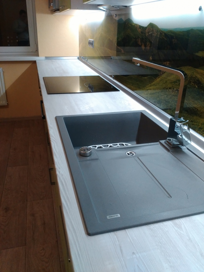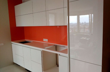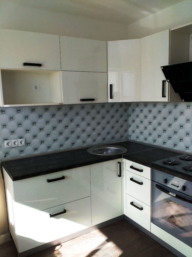 Угловая кухня под заказ с фасадами из пластика. Скинали - закаленное стекло с фотопечатью. Столешница - постформинг Egger. Фурнитура BLUM, Hettich.