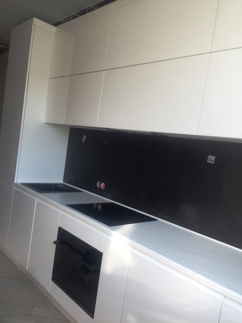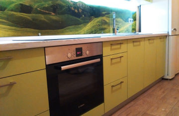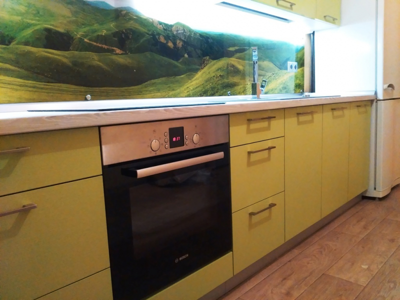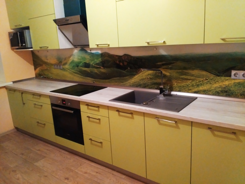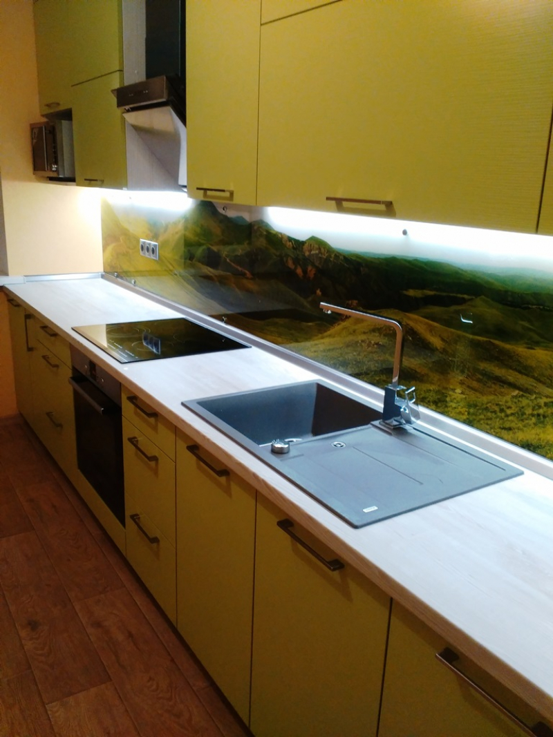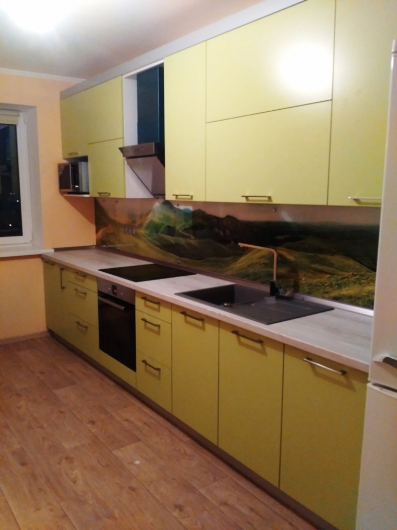 Прямая кухня ЗОВ с фасадами из пластика Лайм. Столешница - постформинг Egger. Скинали - закаленное стекло с фотопечатью. Фурнитура Hettich, Blum. Втроенная посудомоечная машина, духовой шкаф. Светодиодная подсветка рабочей зоны.