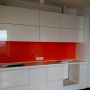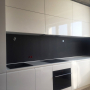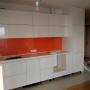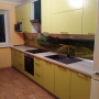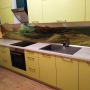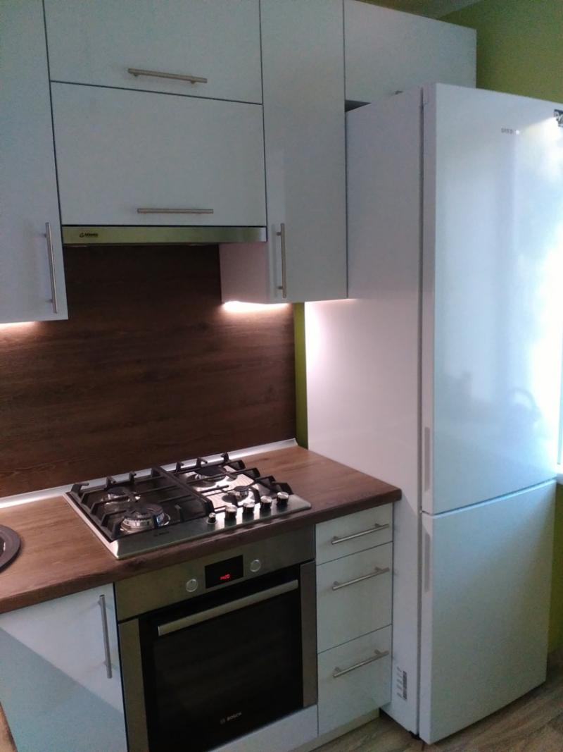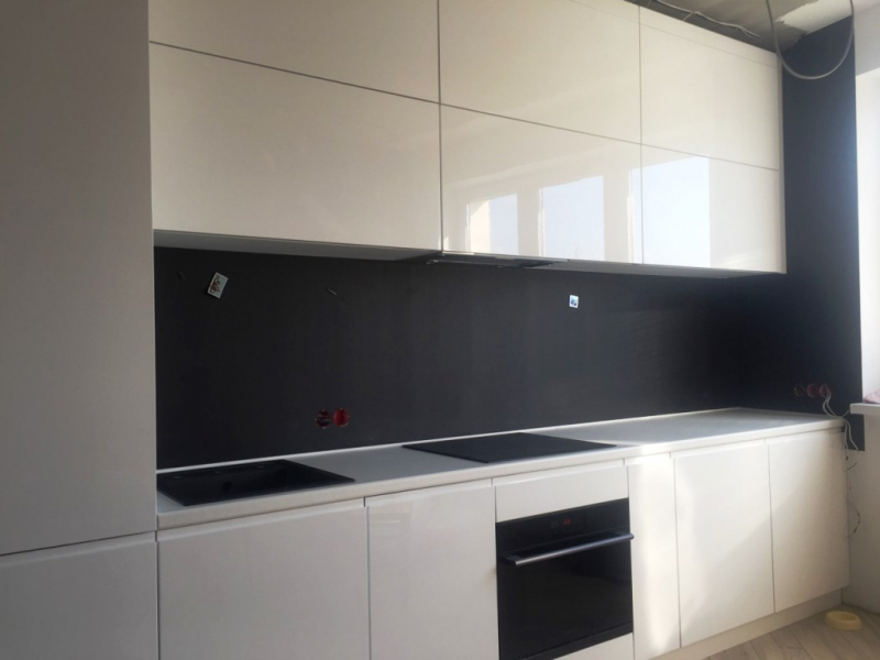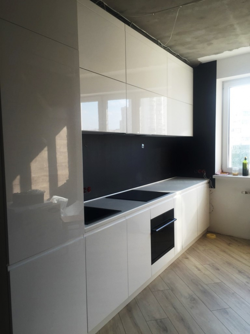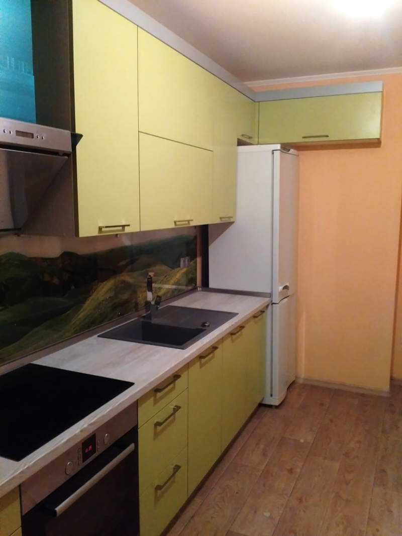 Прямая кухня ЗОВ с фасадами из пластика Лайм. Столешница - постформинг Egger. Скинали - закаленное стекло с фотопечатью. Фурнитура Hettich, Blum. Втроенная посудомоечная машина, духовой шкаф. Светодиодная подсветка рабочей зоны.