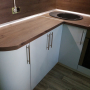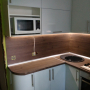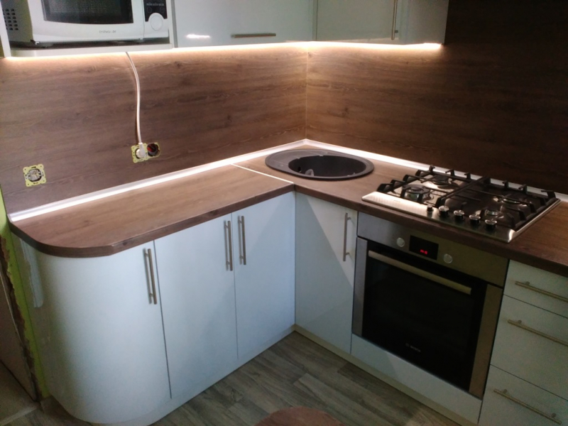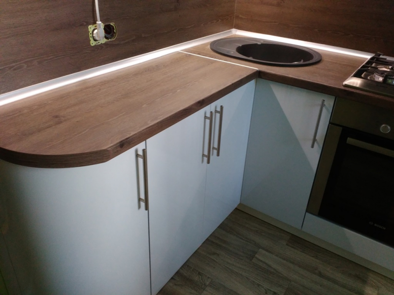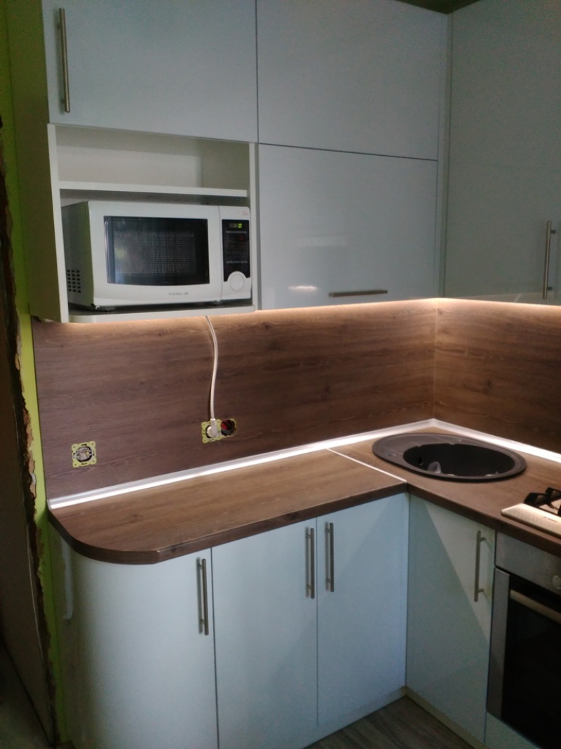 Функциональная угловая кухня ЗОВ в "Хрущевке" из пластика белая со светодиодной подсветкой. Столешница и скинали - постформинг Egger. Фурнитура Hettich, Blum.
