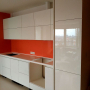 Кухня с фасадами из крашенного МДФ глянец. Ручка - Gola профиль. Столешница - искусственный камень Getacore. Встроенный холодильник, посудомоечная машина, духовой шкаф. Фурнитура BLUM.