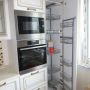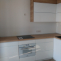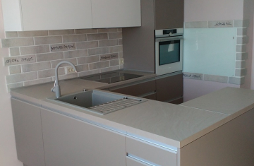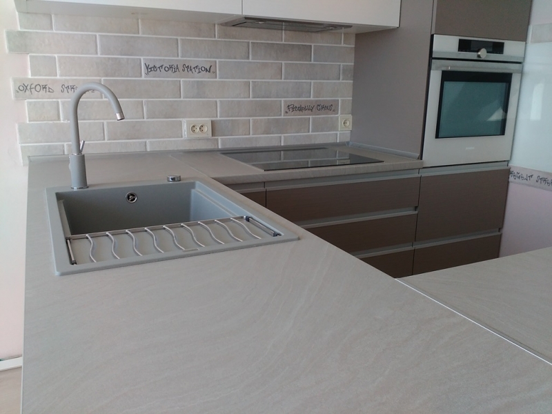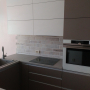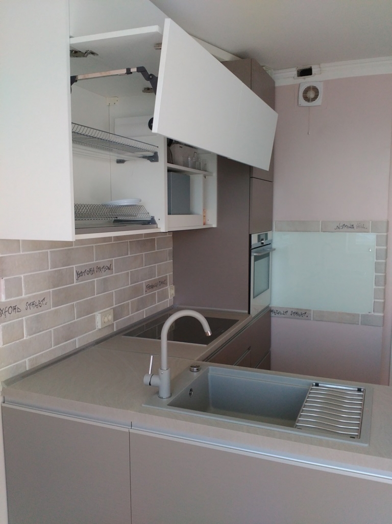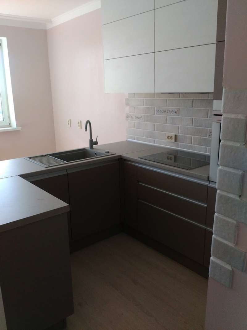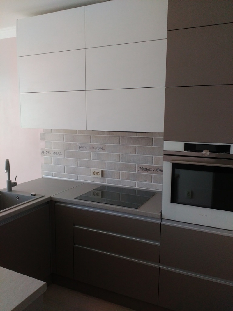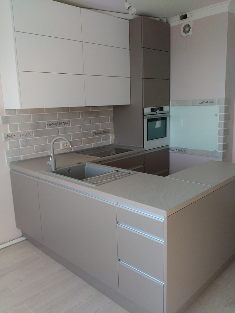 Кухня под заказ с комбинированными фасадами из пластика. Столешница и скинали - постформинг JUAN. Фурнитура Hettich, Blum. Светодиодная подсветка рабочей зоны с дистанционным управлением. Встроенный духовой шкаф и микроволновая печь.