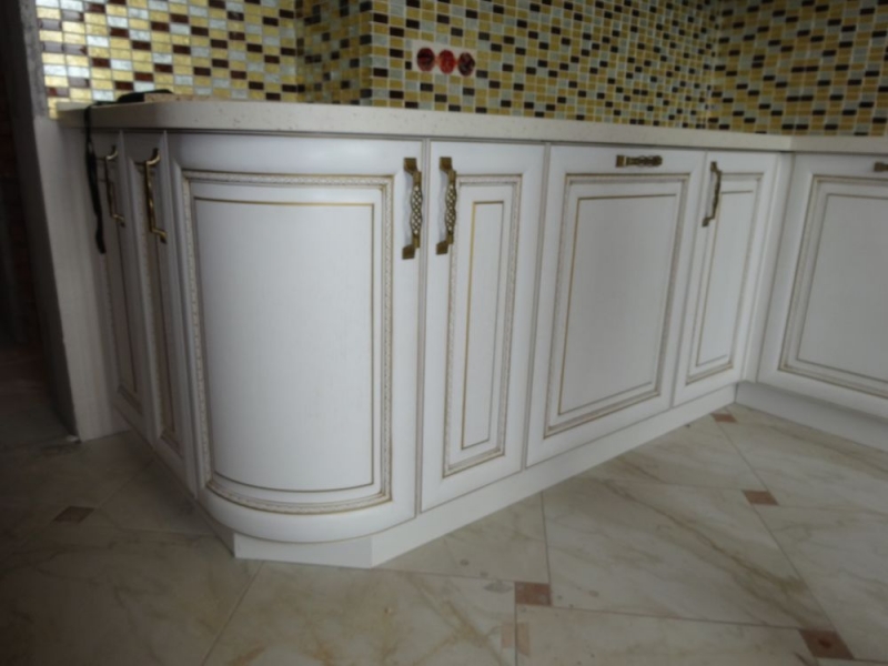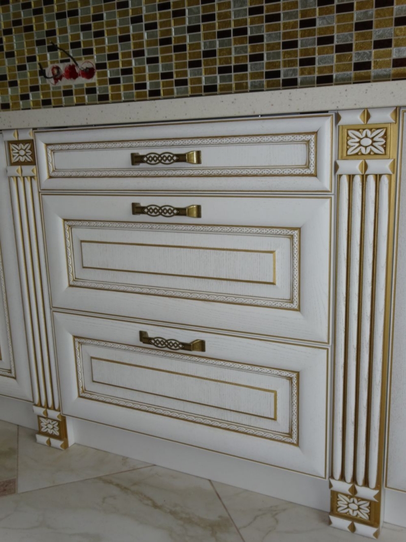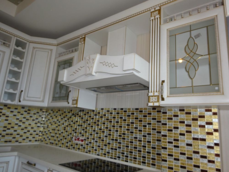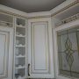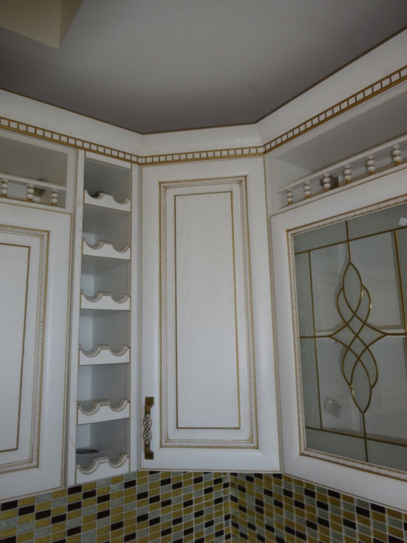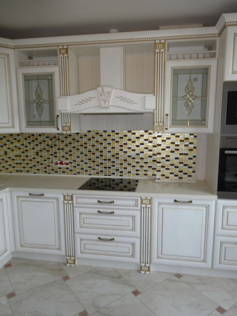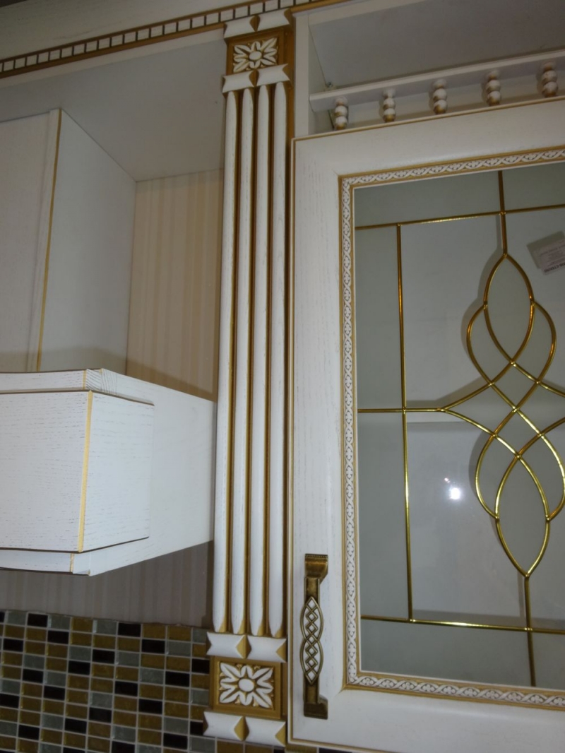 Кухня под заказ из массива ясеня. Белая с патиной золото. Декоративные элементы - балясины, багет, короб для вытяжки, пилястры, витражи. Столешница - искусственный камень. Встроенная стиральная и посудомоечная машина, духовой шкаф и печь СВЧ.