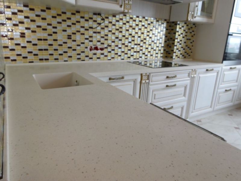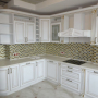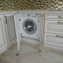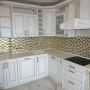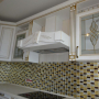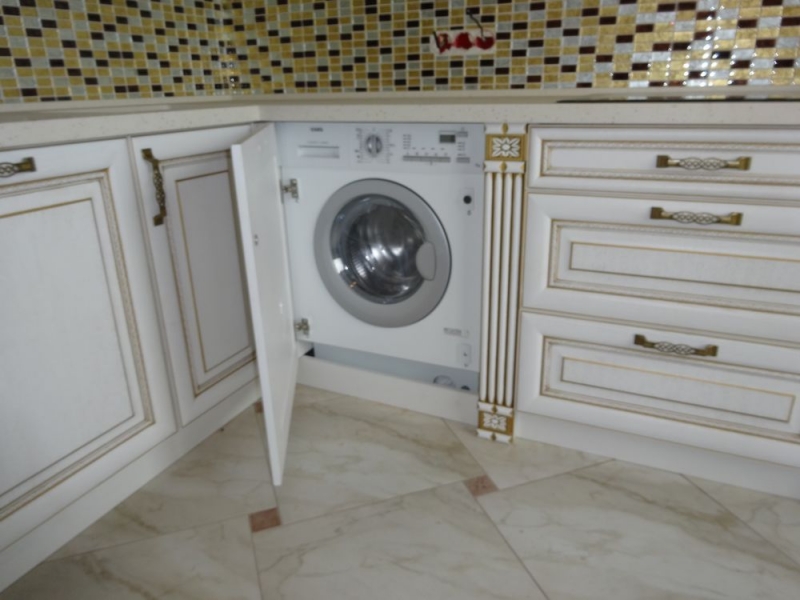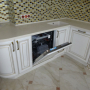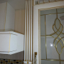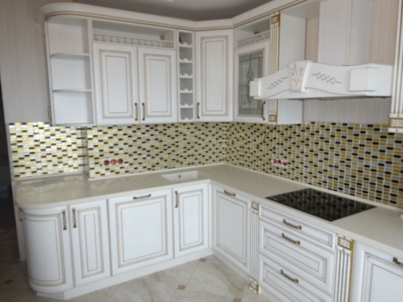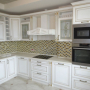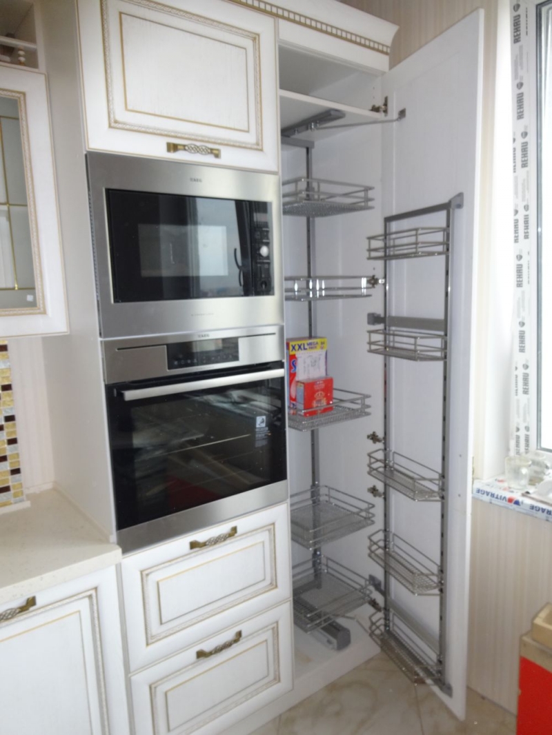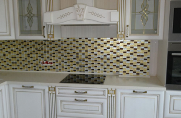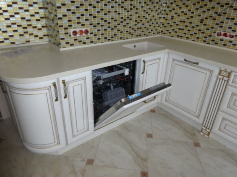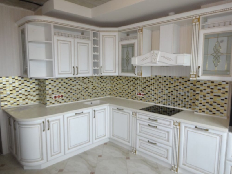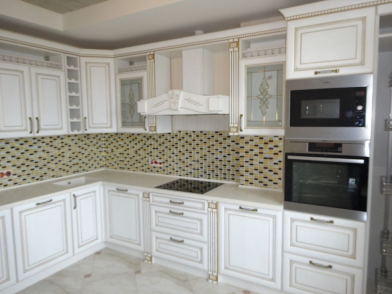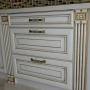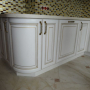 Кухня под заказ из массива ясеня. Белая с патиной золото. Декоративные элементы - балясины, багет, короб для вытяжки, пилястры, витражи. Столешница - искусственный камень. Встроенная стиральная и посудомоечная машина, духовой шкаф и печь СВЧ.