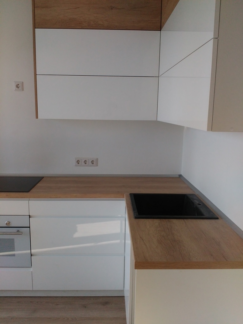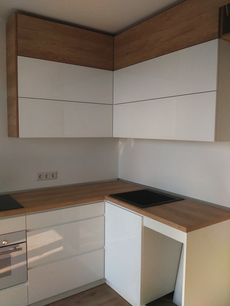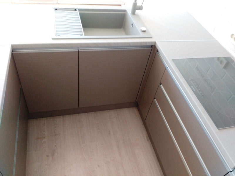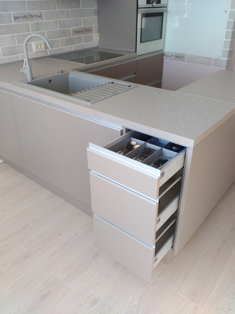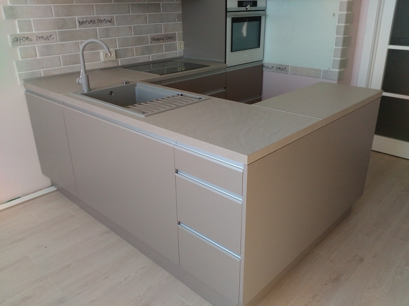 Кухня с фасадами из пластика со скрытыми ручками. Столешница - постформинг Egger. Фурнитура Hettich, Blum