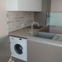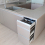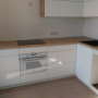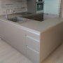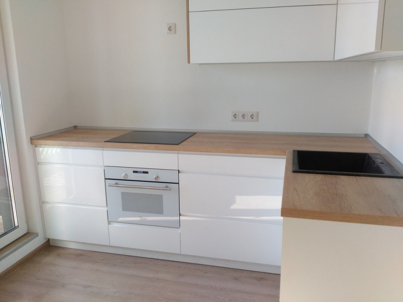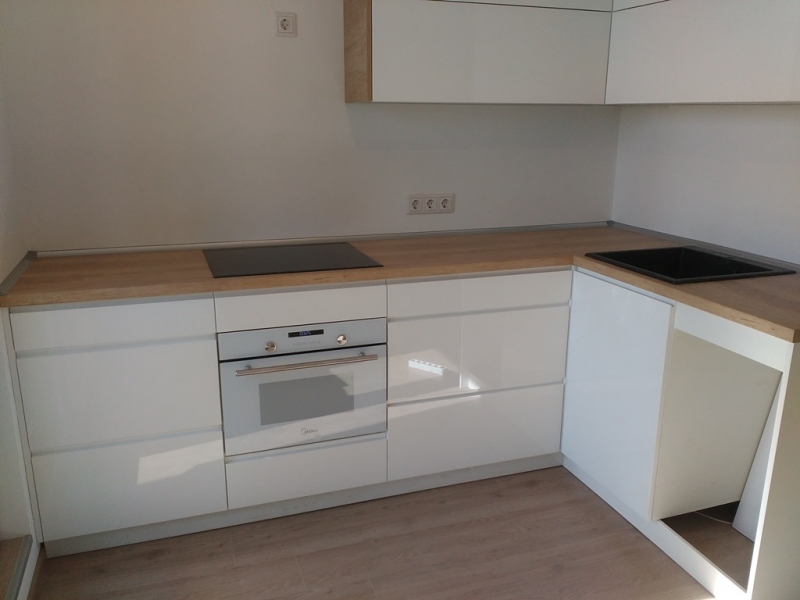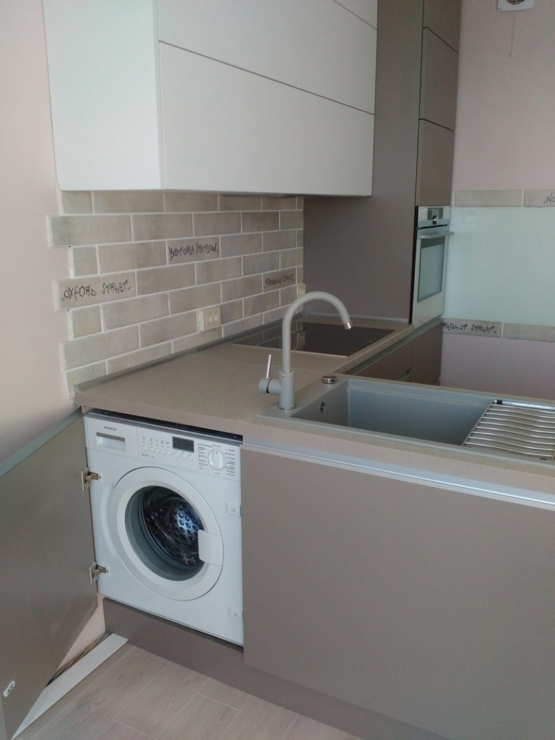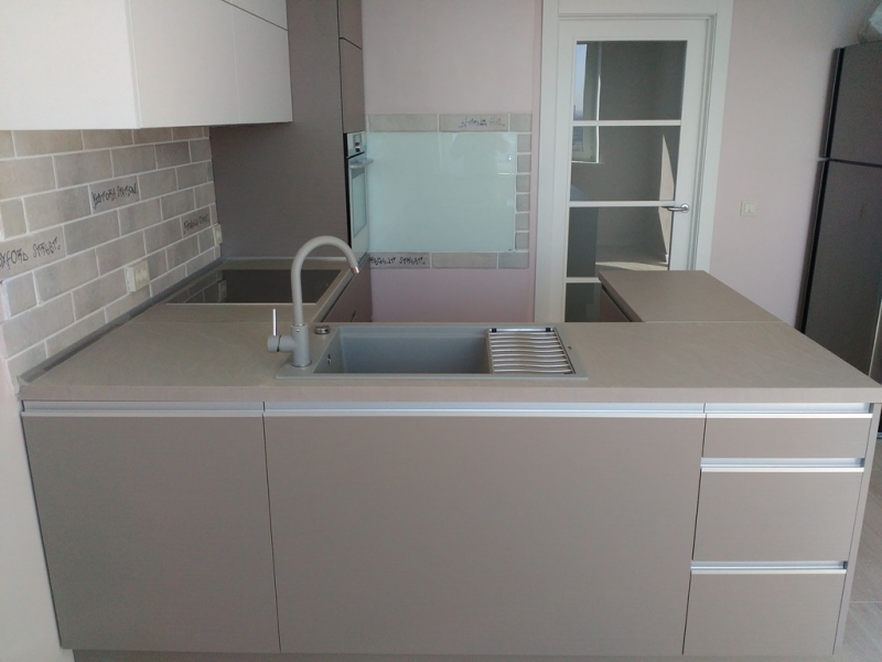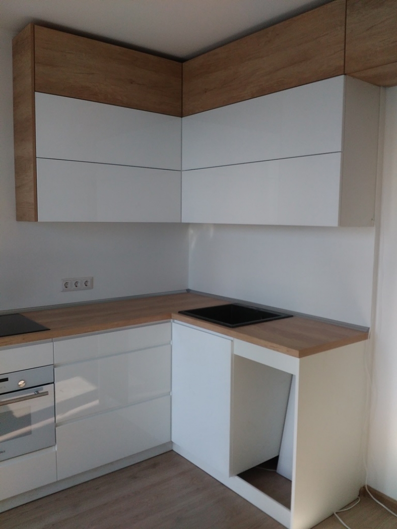 Кухня с фасадами из пластика со скрытыми ручками. Столешница - постформинг Egger. Фурнитура Hettich, Blum