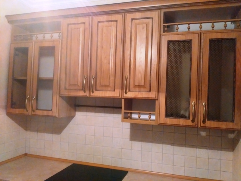 Кухня под заказ из массива Ясеня. Декоративные элементы - решетка, витражи, багет. Столешница и скинали - постформинг. Фурнитура Hettich.
